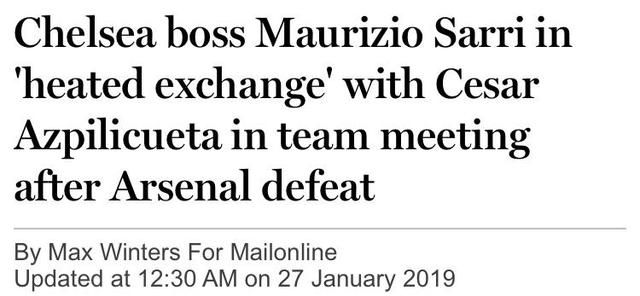 《每日邮报》援引《泰晤士报》消息:上周末切尔西客场不敌阿森纳后,在切尔西队内会议上,主教练萨里与阿斯皮利奎塔发生了激烈的言语碰撞。 当地时间周一,在切尔西内部召开的会议上,阿斯皮利奎塔和萨里发生了一些言语上的不快。《泰晤士报》表示:萨里批评球员们没有发挥出斗志,而阿斯皮利奎塔对于萨里的批评提出反对。 萨里在与阿森纳赛后就曾表示:“我非常生气,这次失败是因为球队的