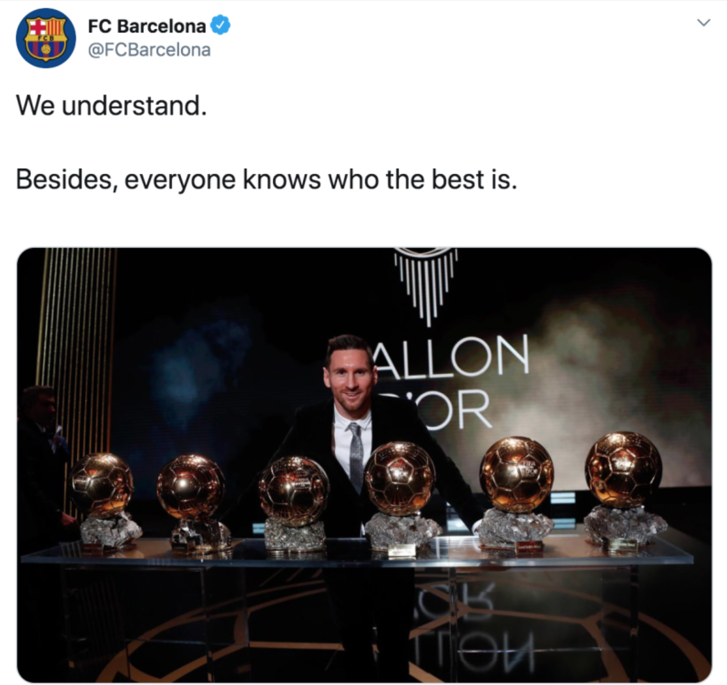 7月20日讯早些时候,法国足球官方宣布:2020年度金球奖将被取消。 随后,巴萨官推转发了这一消息,并晒出了梅西6夺金球奖照片,表示: “我们理解。 此外,其实每个人都知道谁是世界最佳!”